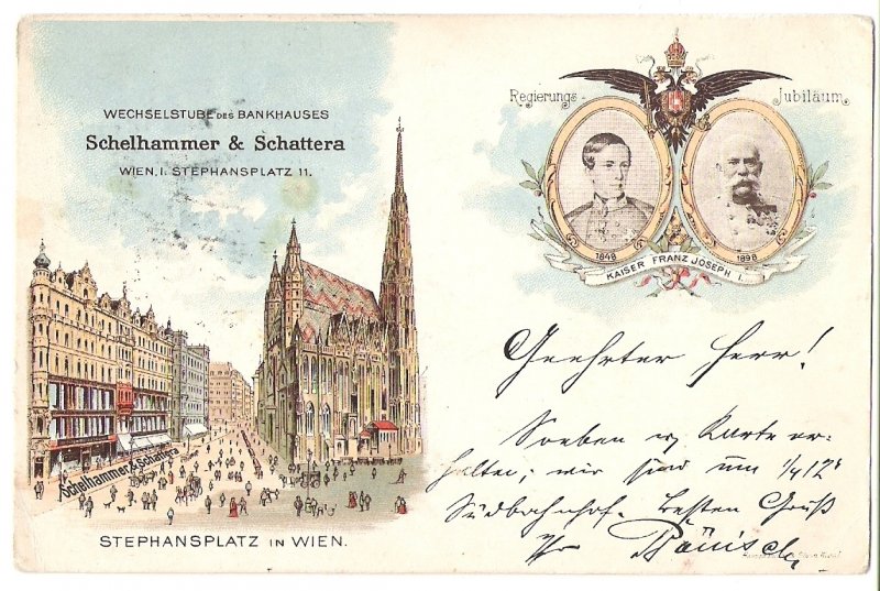 Stephansplatz a dvojportrét císaře Franz Josefa, Vídeň