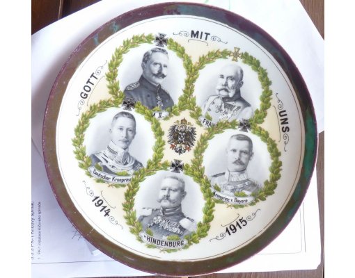 Franz Josef , Wilhelm , Hindenburg , německý a bavorský korunní princ . V museu je již podobný talíř - tento je r.1915 / první je s ručním přepisem 1916 .