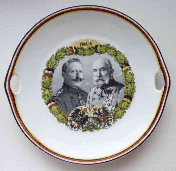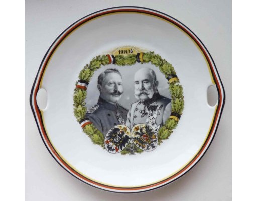 Talíř - dvojportrét Wilhem II. a Franz Josef I. / v tomto a dalších předešlých případech lze stěží usoudit , zda se jedná o novodobou výrobu či vitrínovou zachovalost