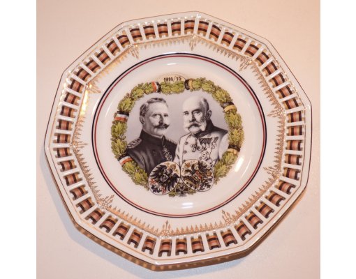 Talíř s vyobrazením císaře Franz Josefa I. a Wilhelma II. se znaky a stuhou.
