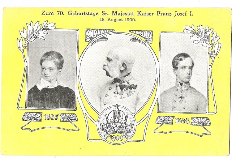 Trojportrét císaře Franz Josefa I. ztvárněný ve žlutém poli