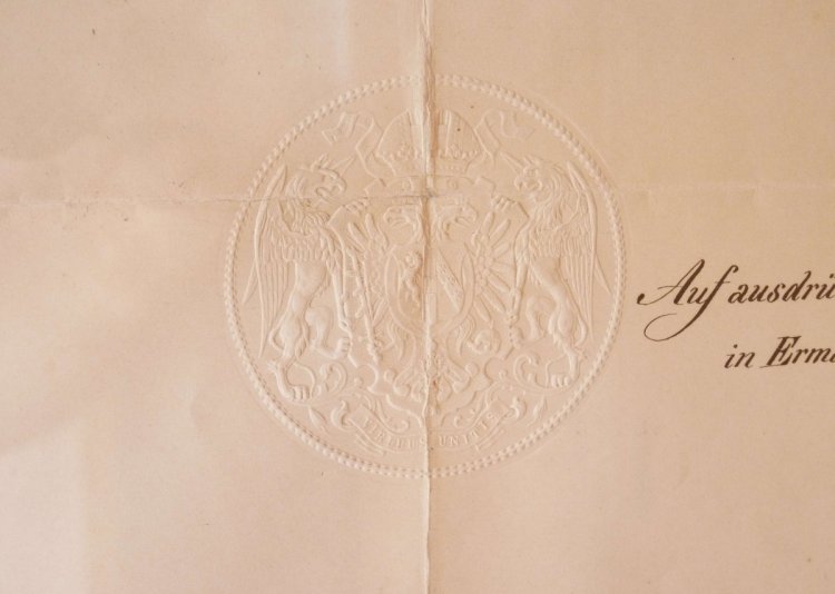 Udělovací listina na pergamenovém papíře - Řád Františka Josefa : pan - MARCUS v. GRISOGONO, s vlastnoručním podpisem Franz Josefa