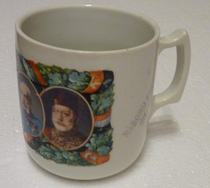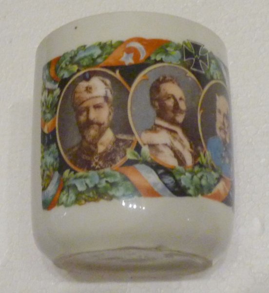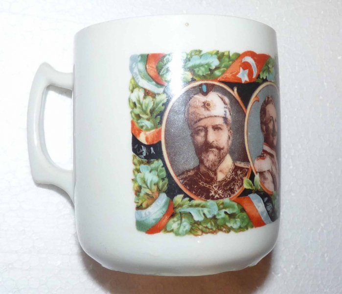 Uherská výroba hrnečku s portréty zástupců čtyřdohody - František Josef , Wilhelm , Mohamed a Ferdinand / vzácný hrneček