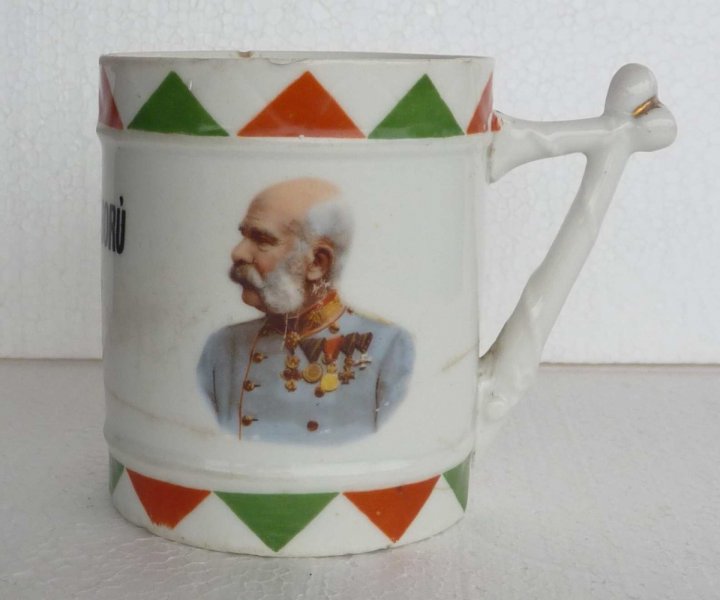 1914/1915 - uherský hrnek tzv. bubínek s portrétem císaře Franz Josefa / poškozený - tato varianta je vzácnější