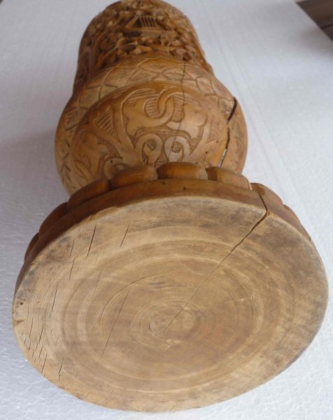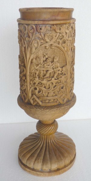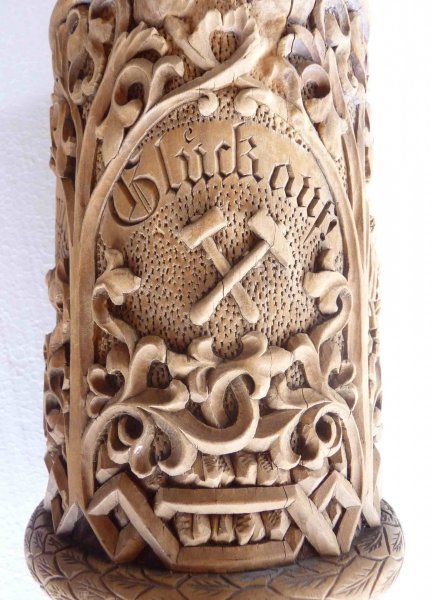 Dřevěný pohár - výjevy VIRIBUS UNITIS / hornictví / harfa - zřejmě hudební spolek / oslava a hold životu