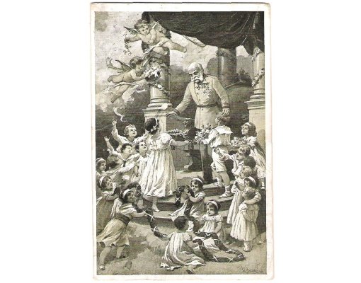 Vítání Franz Josefa dětmi s květinami