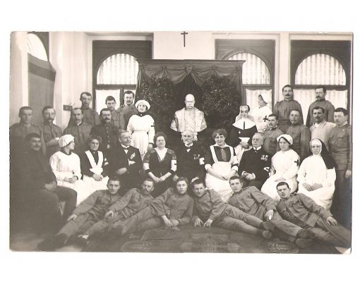 Vojenská nemocnice -Most,personál a zranění vojáci s bustou Franz Josefa I.
