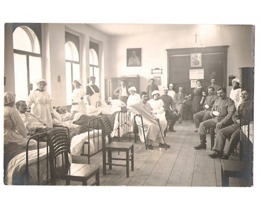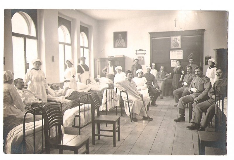 Vojenská nemocnice-MOST!!, zranění vojáci na postelích, Franz Joseph na stěně