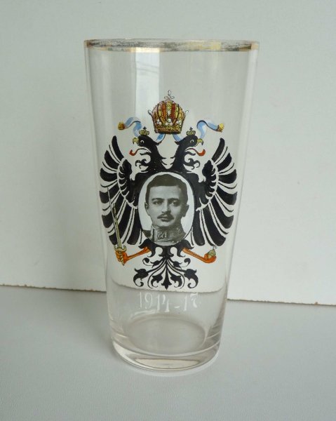 Vysoká sklenička s portrétem císaře Karla a rakouskou orlicí