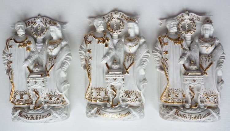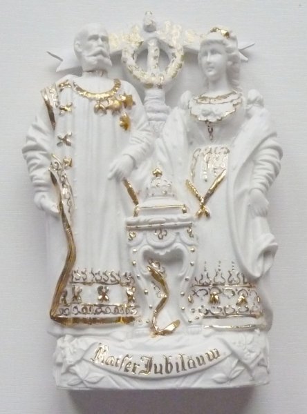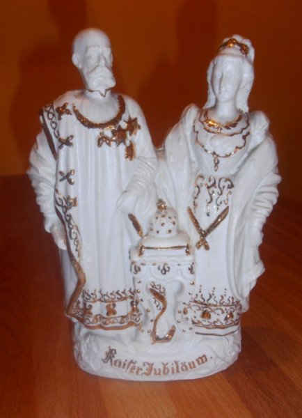 Soukromá porcelánka - Žacléř / sousoší Františka Josefa a Elisabety 1848 - 1898 , třetí exemplář v museu ( celkově chybějící horní praporec s letopočtem ) , vzácná položka + foto po rekonstrukci chybějící části + foto všech tří exemplářů v museu